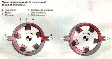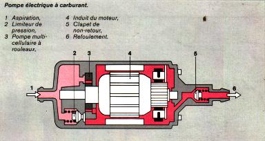 La pompe utilisée est une pompe électrique multicellulaire à rouleaux. Pompe et moteur électrique sont logés dans un carter commun et sont balayés par le carburant qui assure le bon refroidissement du moteur électrique. Le débit de la pompe est toujours supérieur au besoin maximal du moteur à combustion, ce qui permet de maintenir la pression dans le circuit d'alimentation en carburant quelles que soient les conditions de service. Au démarrage, la pompe à carburant tourne tant que le commutateur de démarrage est actionné. La pompe reste enclenchée dès que le moteur a démarré. Un circuit de sécurité empêche le refoulement du carburant quand l'allumage est sous tension, moteur arrêté, comme c'est par exemple le cas à la suite d'un accident. La pompe à carburant est logée à proximité immédiate du réservoir et fonctionne sans entretien. |